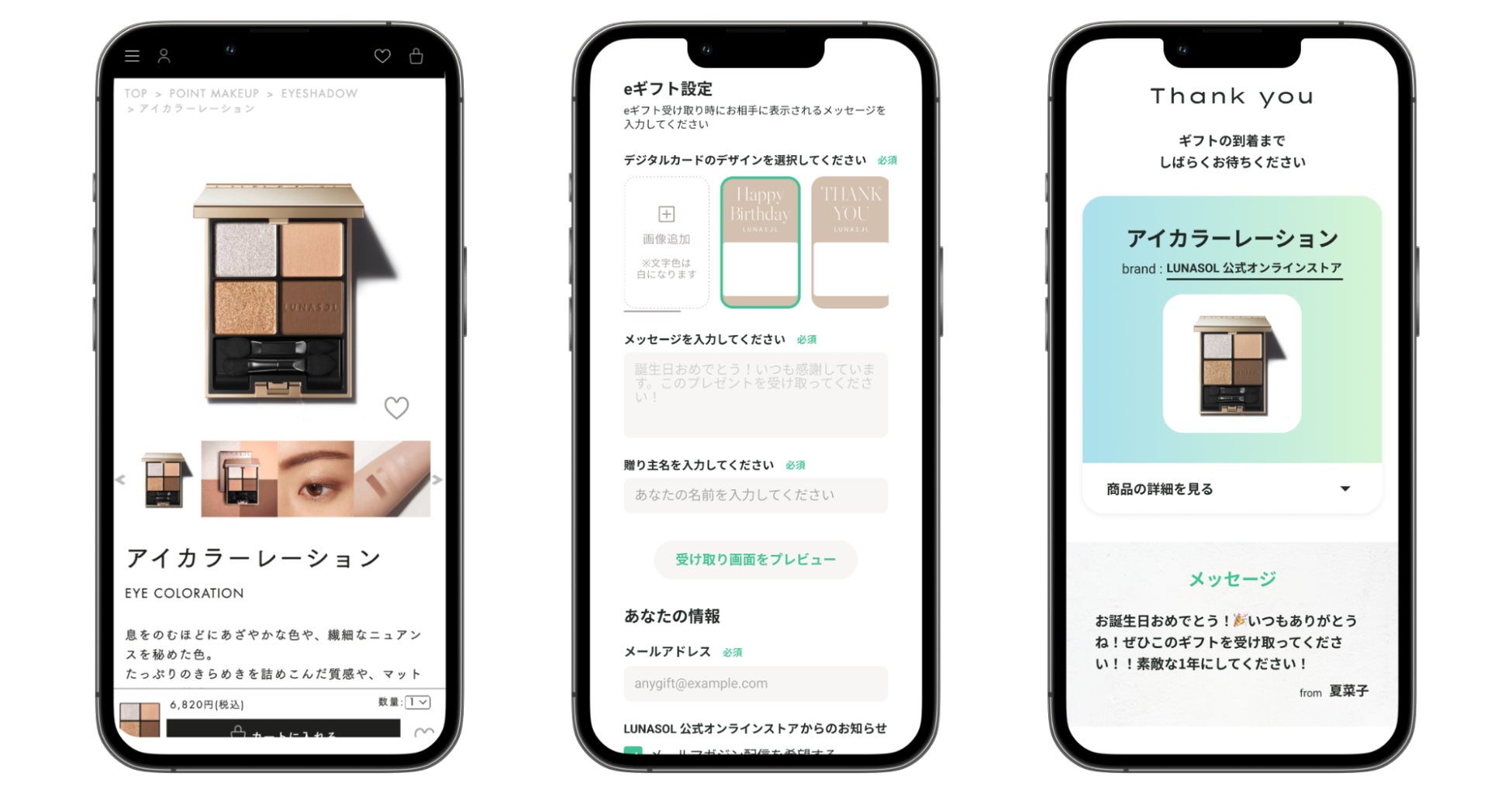 今回、当社のAnyGiftの提供により、「LUNASOL 公式オンラインストア」にてアイカラーレーションなど、人気のメイクアップアイテムがeギフトとして贈れるようになります。