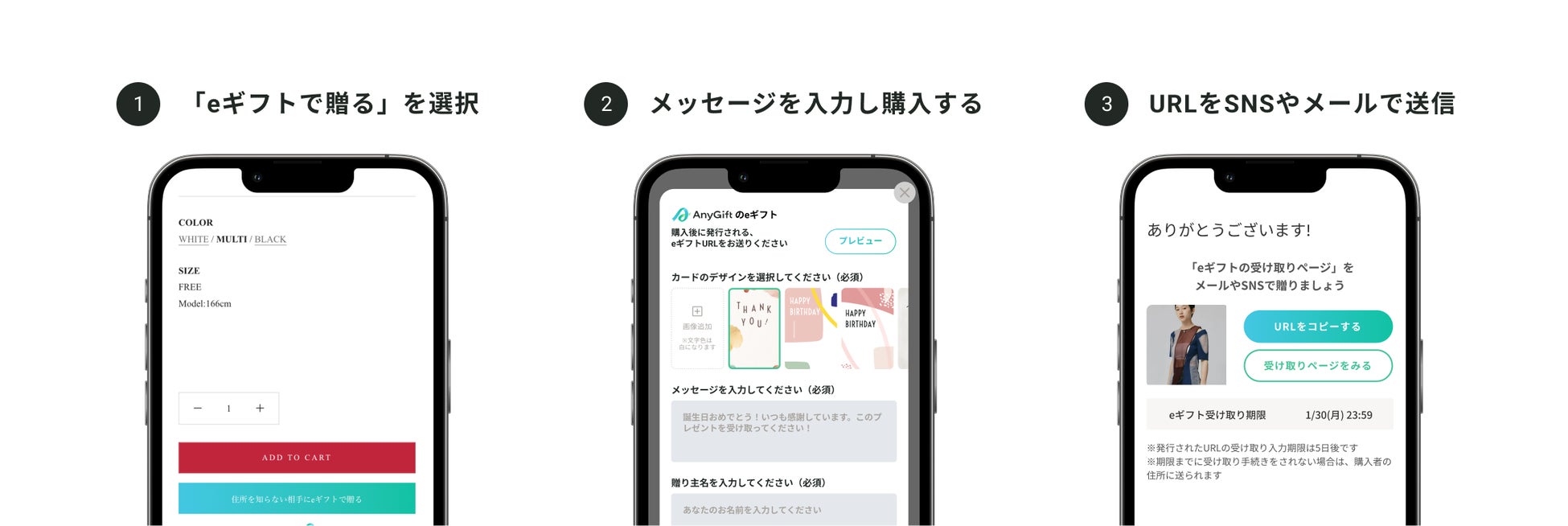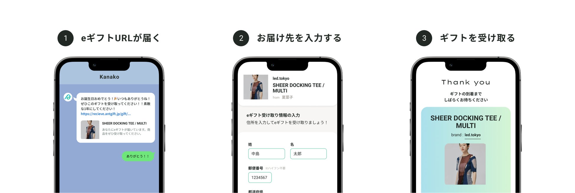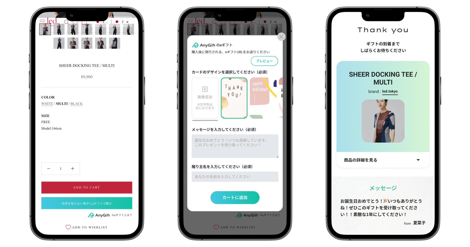 そこでこの度、お客様にもっと気軽にled.tokyo・ooju・LA PEAUDE GEMの商品をプレゼントとしてご利用いただきたい。それぞれの自由な着こなしをもっと楽しんでほしいという思いから、AnyGiftの導入を決定いたしました。