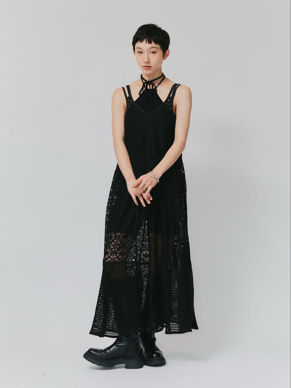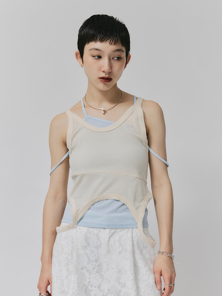 シアー感のあるサマーベロアをタンクトップに、透け感あるカットソーをキャミソールに使用。キャミソールの生地は伸縮性と杢っぽい質感が特徴です。