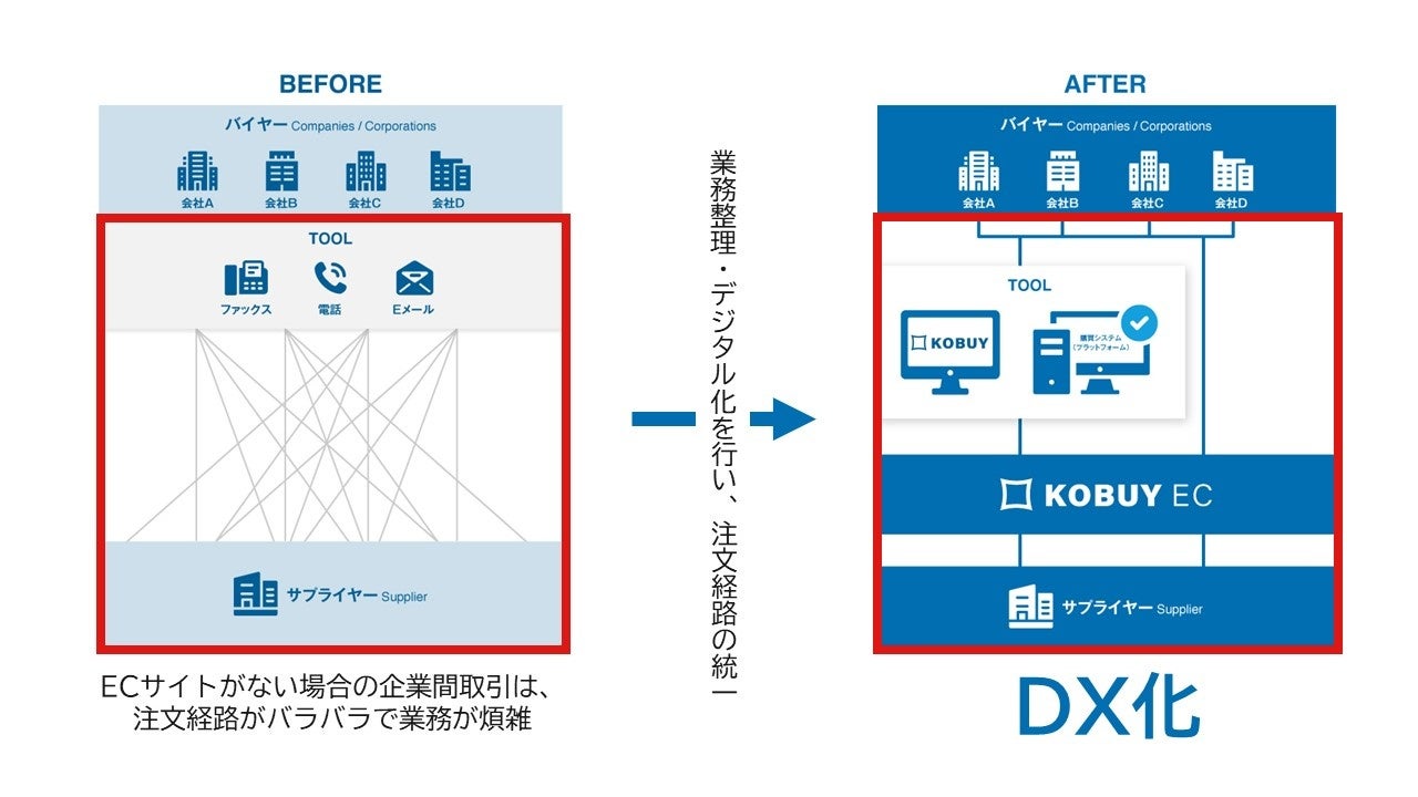バイヤーとサプライヤーの双方に対してDX化の支援を行うことが、日本全体のDX推進に不可欠と判断し、「KOBUY EC」を立ち上げました。