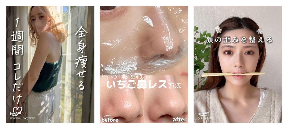 写真引用(左から、タイパ痩せ / ワセリン美容 / 左右対称顔トレ)