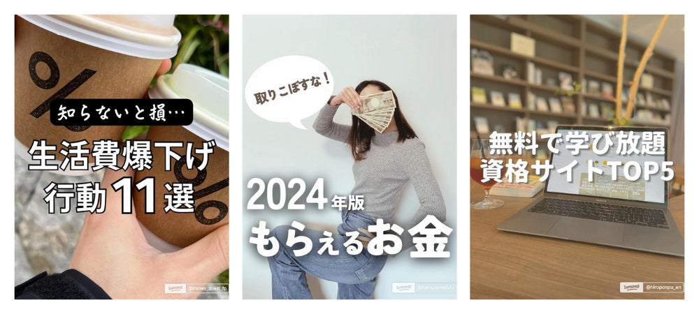 写真引用(左から、生活費爆下げ行動 / 2024版もらえるお金 / 無料で資格学び放題)
