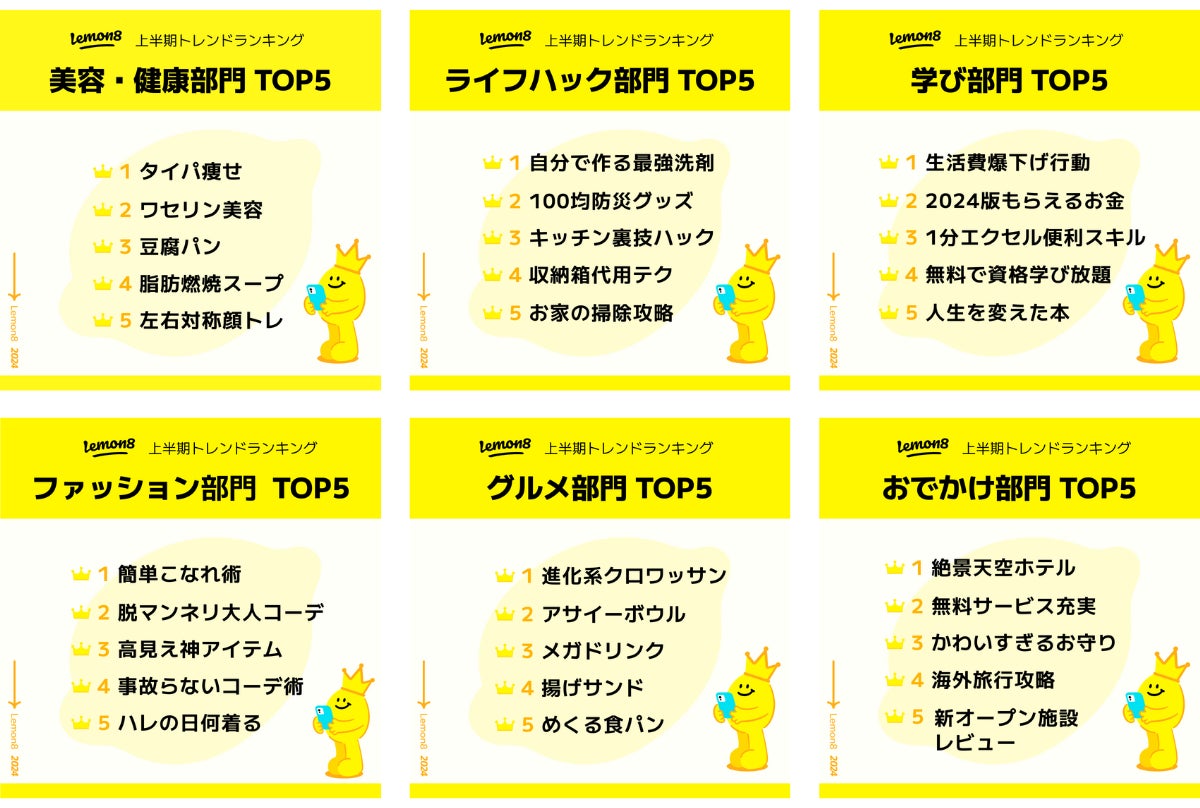 ライフスタイル共有アプリ「 Lemon8(レモンエイト)」は、2024年にLemon8内で投稿された約50万の投稿の分析結果を元に「2024上半期トレンドランキング」を発表しました。2024年上半期では、生活に役立つ情報の保存数が増えています。特に注目度の高かった「美容・健康」「ライフハック」「学び」「ファッション」「グルメ」「おでかけ」の6部門を選出し、各ランキングTOP5を紹介します。
