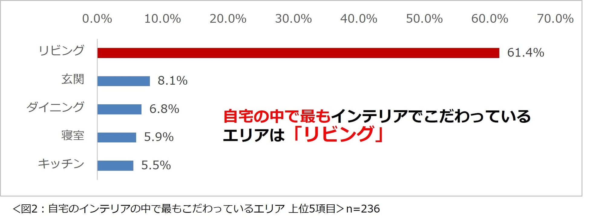 続いて、自宅のインテリアに「とてもこだわっている」「こだわっている」と回答した 236 名の方に、最もインテリアにこだわっているエリアを尋ねたところ、6 割以上の人が「リビング」と回答しました。(図 2)