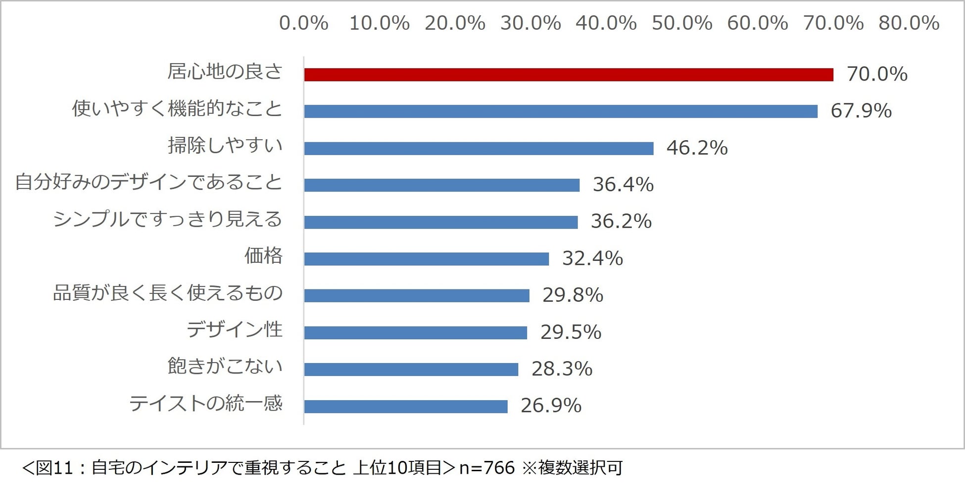 「ご自宅のインテリアで重視することは何ですか?」と尋ねたところ、「居心地の良さ」という回答が最も多く 7 割となり、続いて「使いやすく機能的なこと」(67.9%)という回答が挙げられました。(図 11)