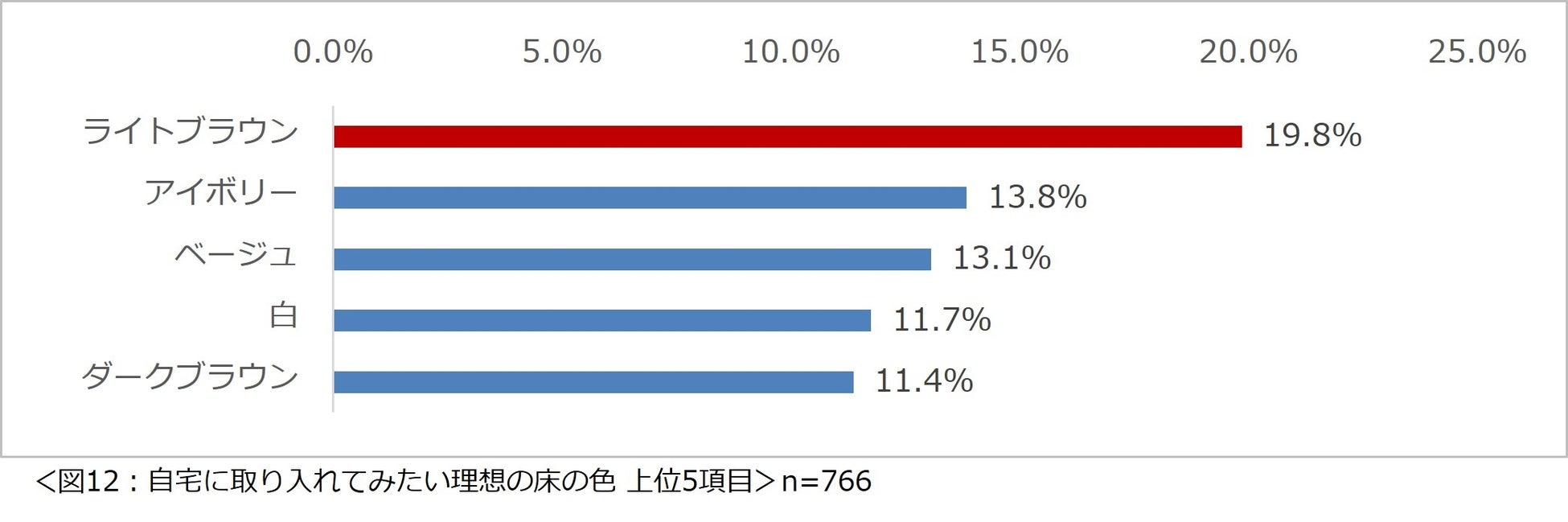 「自宅に取り入れてみたい理想の床の色はどれですか?」と尋ねたところ、1 位は「ライトブラウン」(19.8%)、2 位「アイボリー」(13.8%)、3 位「ベージュ」(13.1%)と、ナチュラルテイストが人気の色味の上位に並びました。(図 12)