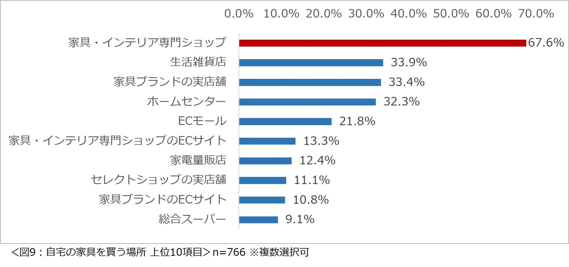 「家具はどこで買いますか?」と尋ねたところ、「家具・インテリア専門ショップ」という回答が最も多く約 7 割、続いて「生活雑貨店」、「家具ブランドの実店舗」、「ホームセンター」と回答した人がそれぞれ約3割いました。インテリアを選ぶときに Instagram が参考にされていた一方で、購入は実店舗で行う人が多いことが分かりました。(図 9)