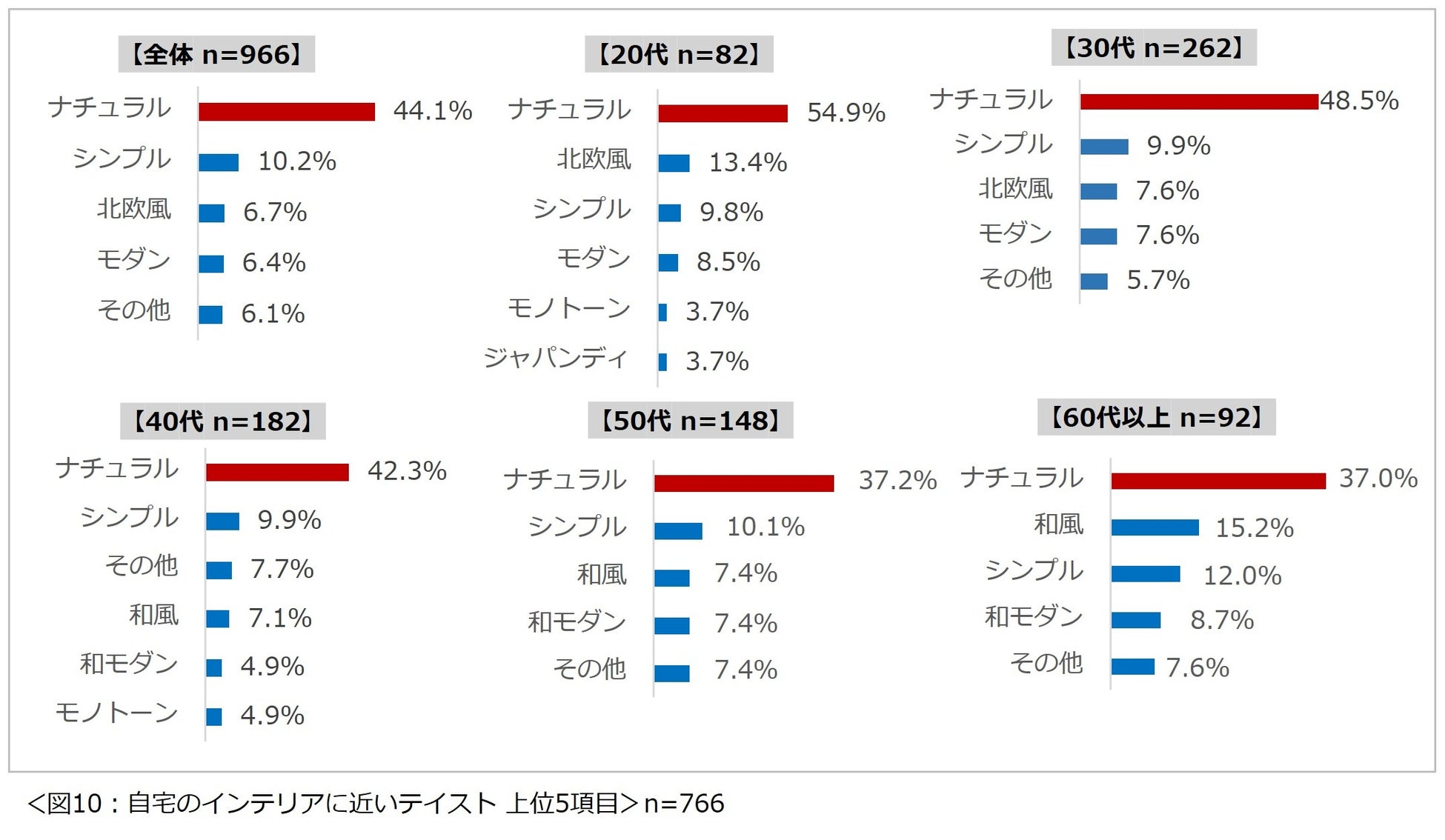 「自宅のインテリアに近いテイストはどれですか?」という問いに、以下の選択肢から選んでもらったところ、全体では 4 割以上の人が「ナチュラル」と回答。年代別に見ても全年代で「ナチュラル」が 1 位となり、年代に関わらず支持されていることが分かりました。(図 10)
