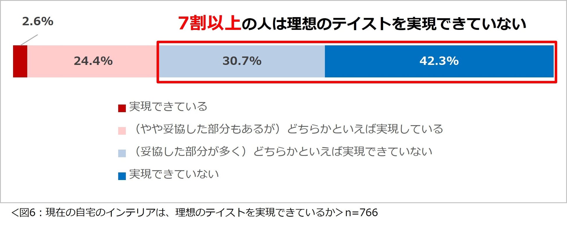 「自宅のインテリアは、理想のテイストを実現できていますか?」と尋ねたところ、「実現できていない」と回答した人が 4 割以上となり、「(妥協した部分が多く)どちらかといえば実現できていない」(30.7%)と回答した人と合わせると、7 割以上の人が理想のテイストを実現できていないことが分かりました。(図 6)