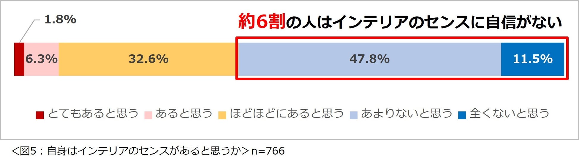 「自身はインテリアのセンスがあると思いますか?」と尋ねたところ、「あまりないと思う」と回答した人が最も多く約半数、「全くないと思う」(11.5%)と回答した人と合わせると、自身のインテリアセンスに自信がない人が約 6 割いることが分かりました。(図 5)