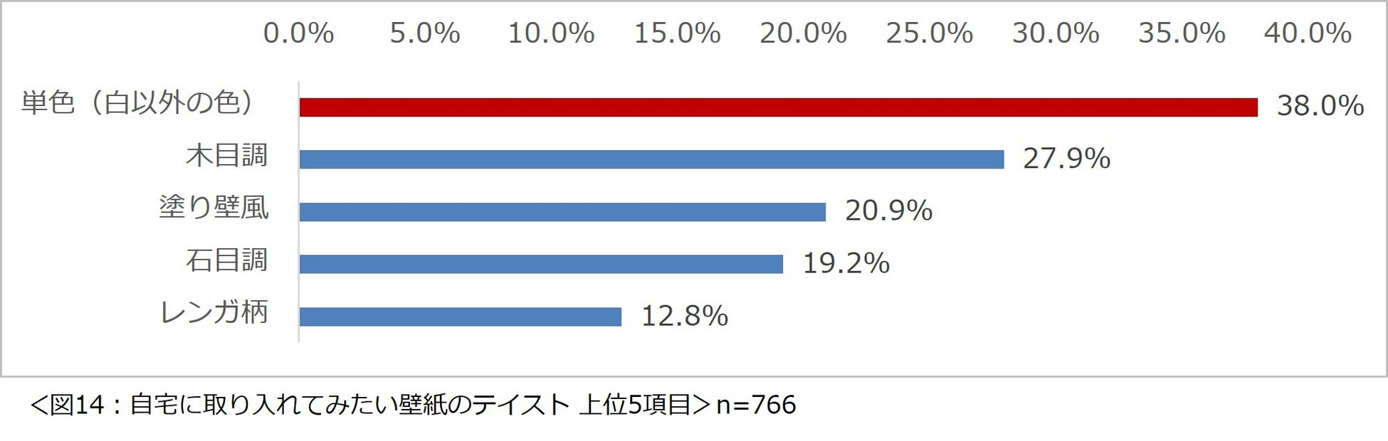 さらに、「自宅に取り入れてみたい壁紙のテイストはありますか?」と尋ねたところ、1 位は「単色(白以外の色)」(38.0%)、2 位「木目調」(27.9%)、3 位「塗り壁風」(20.9%)という結果になりました。(図 14)