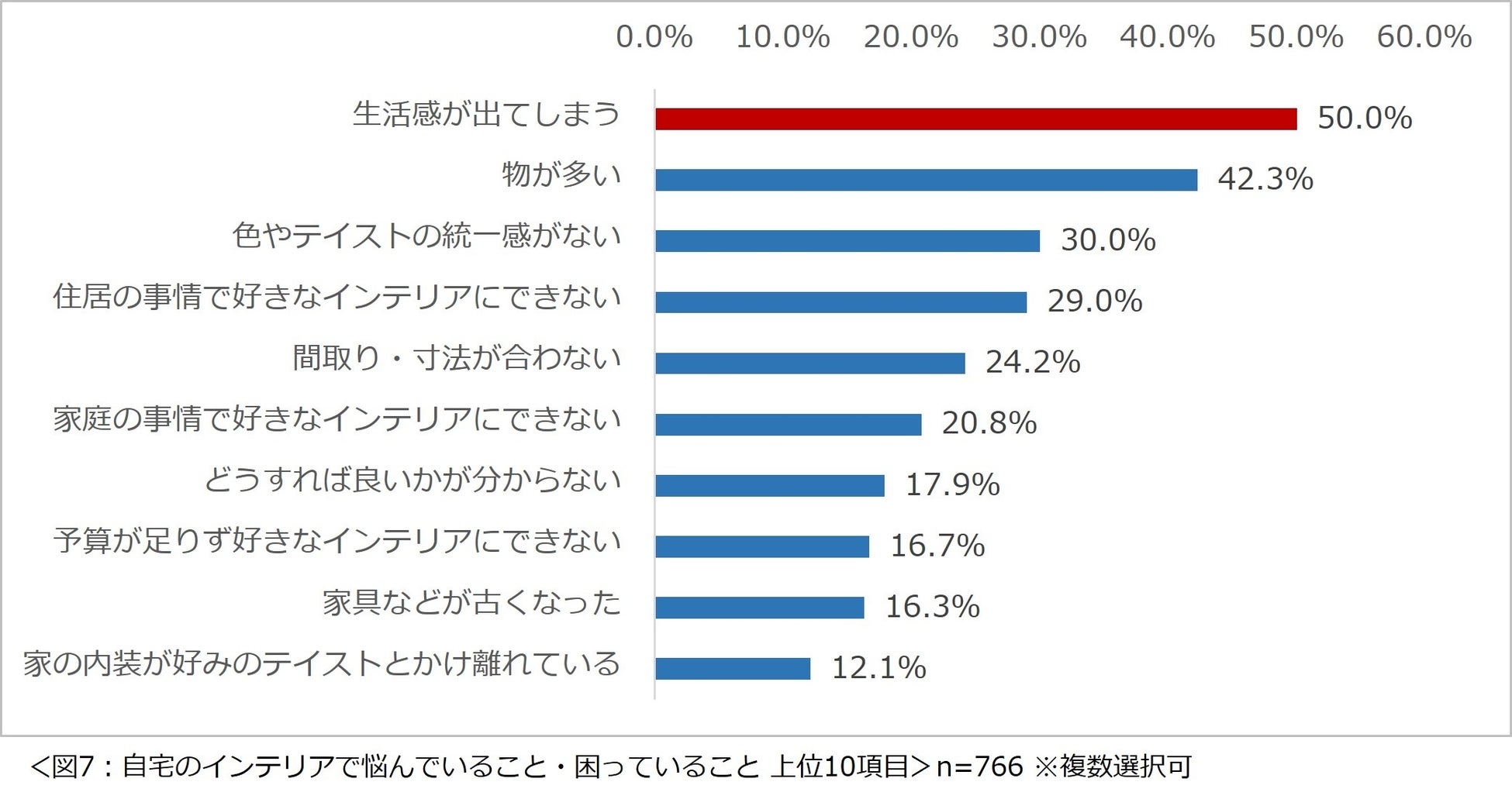 「自宅のインテリアで悩んでいることや困っていることは何ですか?」と尋ねたところ、「生活感が出てしまう」という回答が最も多く 5 割にのぼり、「物が多い」(42.3%)、「色やテイストの統一感がない」(30.0%)という回答が続きました。(図 7)
