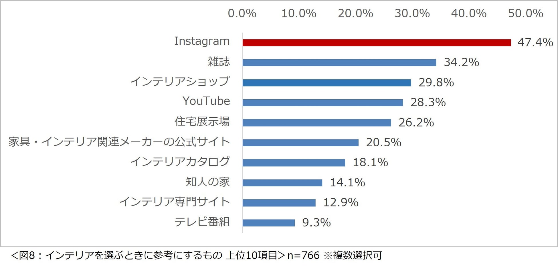 「インテリアを選ぶときに参考にするものはどれですか?」と尋ねたところ、「Instagram」が最も多く 4 割以上の人が回答。「雑誌」(34.2%)、「インテリアショップ」(29.8%)という回答が続きました。(図 8)