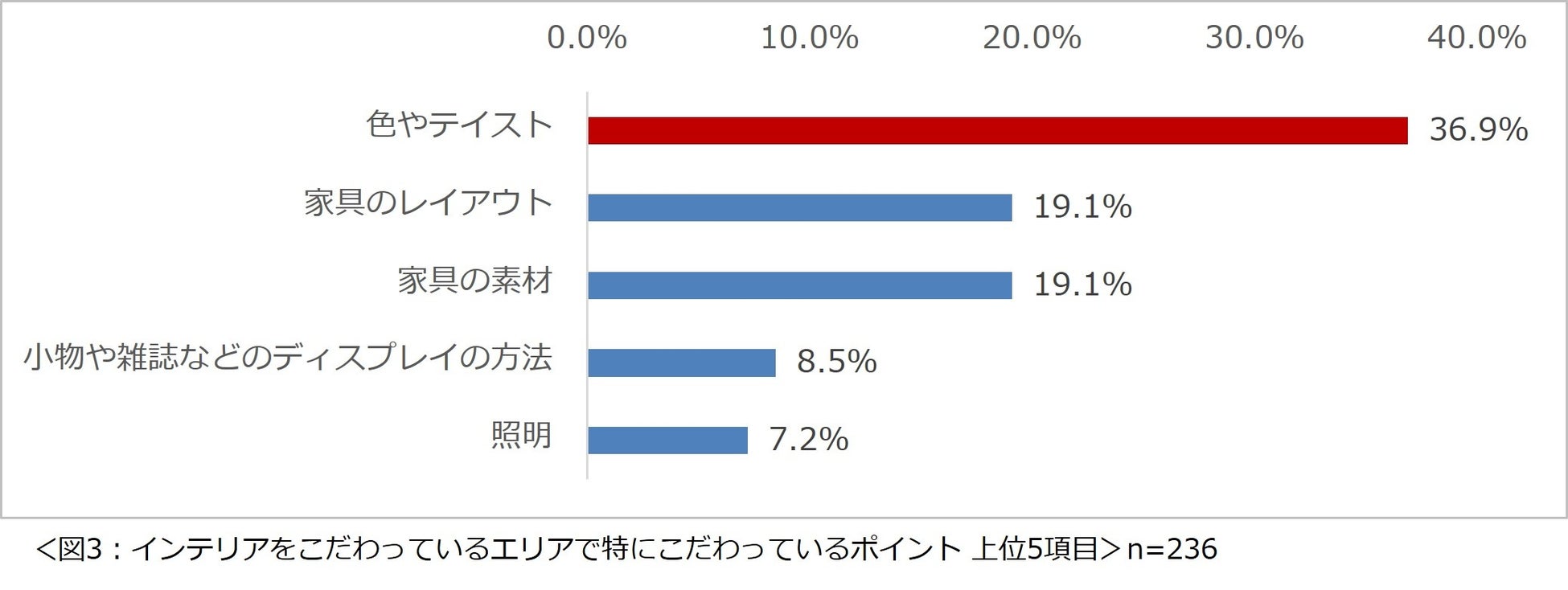 また、こだわりのエリアで特にこだわっているポイントを尋ねたところ、「色やテイスト」(36.9%)という回答が最も多く、同率で「家具のレイアウト」(19.1%)と「家具の素材」(19.1%)が続きました。(図 3)