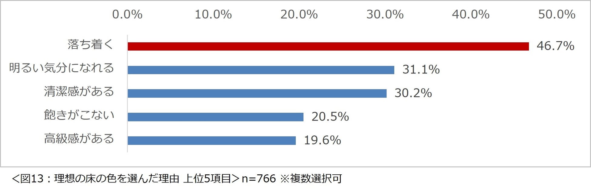 続いて、取り入れてみたい理想の床の色を選んだ理由を尋ねたところ、「落ち着く」を選んだ人が最も多く、4 割以上の人が自身が落ち着く色を選択したことが分かりました。(図 13)
