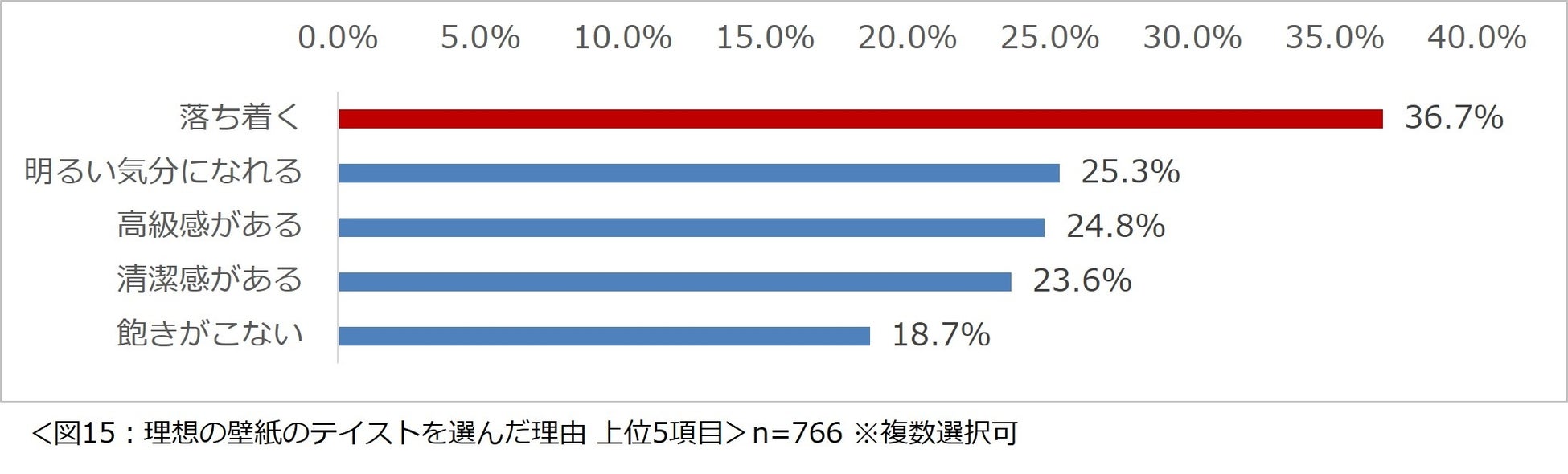 続いて、取り入れてみたい壁紙のテイストを選んだ理由を尋ねたところ、理想の床の色と同じく「落ち着く」が最多で、約 4 割の人が回答しました。(図 15)
