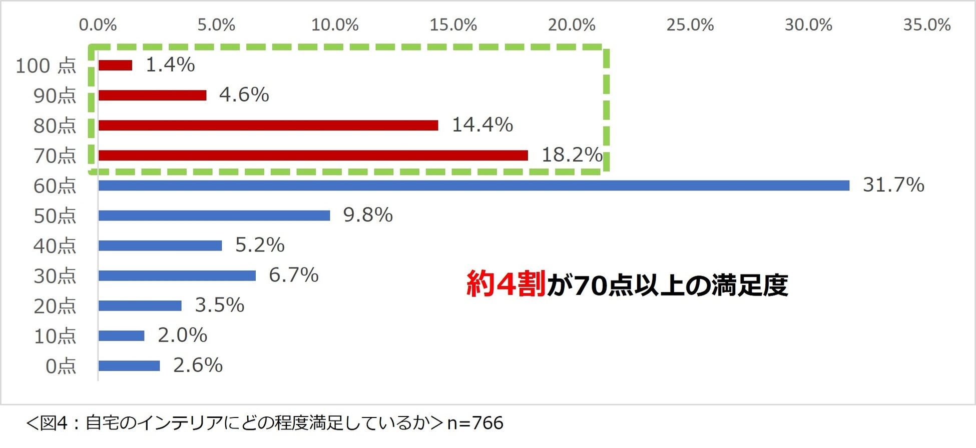 「自宅のインテリアにどの程度満足していますか?」という問いに点数で答えてもらったところ、約 4 割の人が「70 点以上」と回答しました。(図 4)