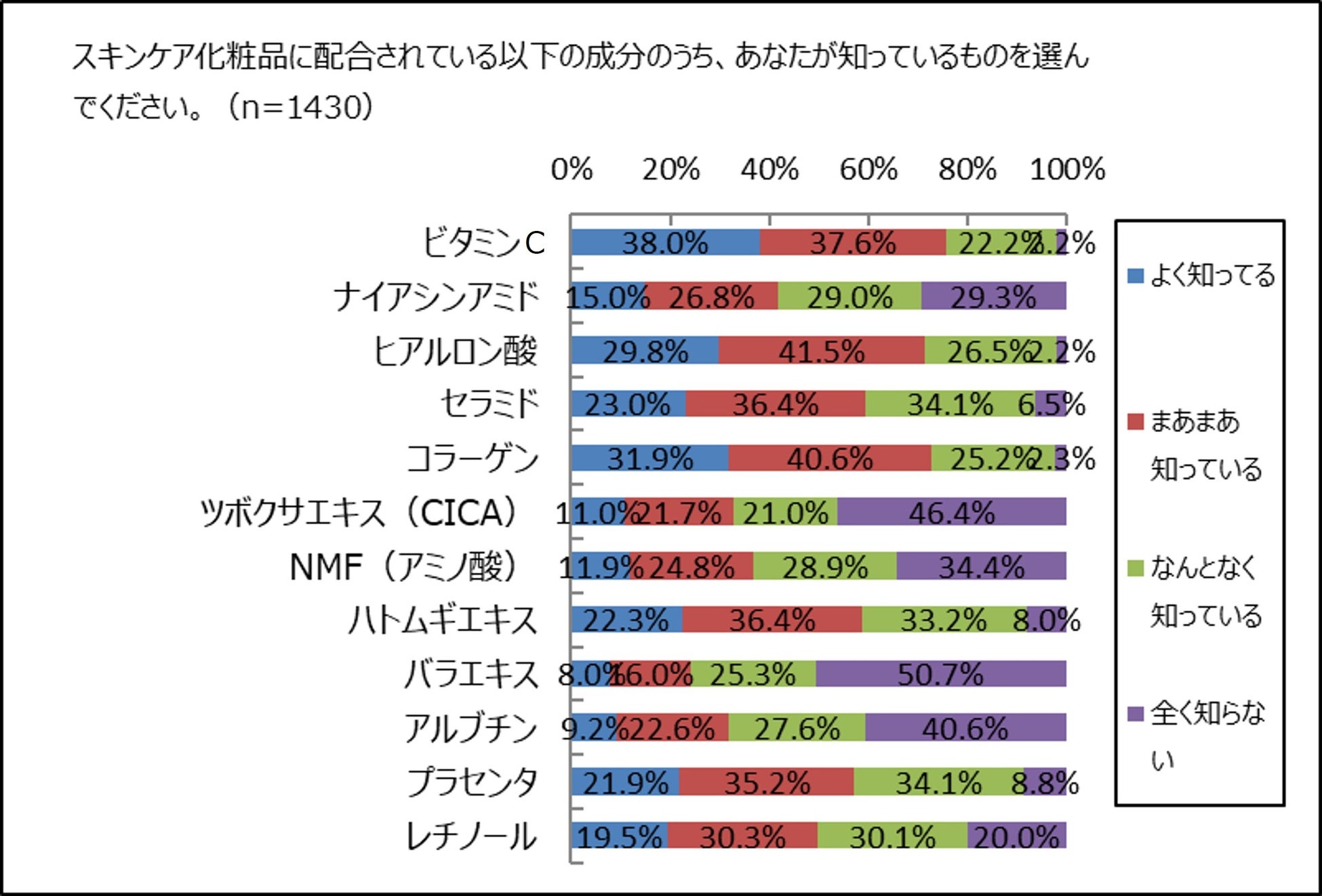 主要なスキンケア配合成分12種類の世代別認知度を分析。