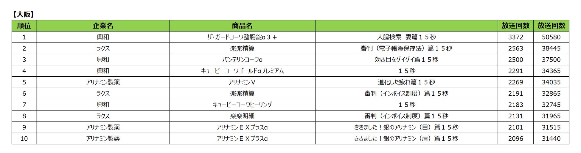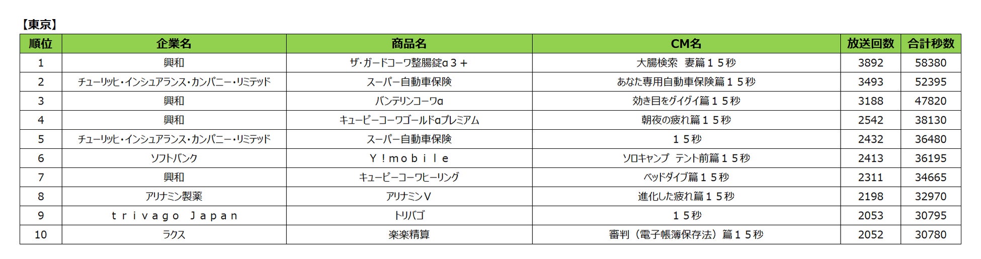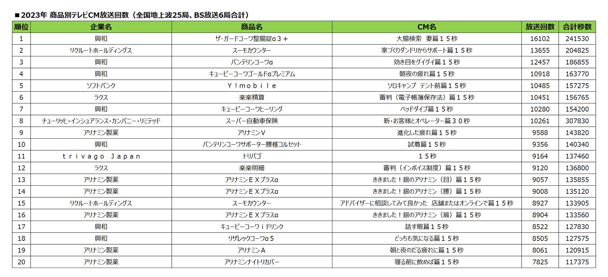2023年、最も多く流れたCM素材は、興和「ザ・ガードコーワ整腸錠α3+」大腸検索 妻篇15秒でした。上位陣は製薬会社や保険会社などの長寿CMが並ぶ中、ソフトバンク「Y!mobile」ソロキャンプ テント前篇15秒が6月から10月の頭にかけてオンエアされ5位にランクインしました。定期的にCMを更新しているソフトバンクですが、約4ヶ月という比較的長めなオンエア期間がこの順位につながりました。2023年10月に始まったインボイス制度と電子帳簿保存法に合わせてオンエアされた6位のラクス「楽楽精算」審判(電子帳簿保存法)篇15秒と、12位のラクス「楽楽明細」審判(インボイス制度)篇15秒は2023年ならではのCMとなっております。