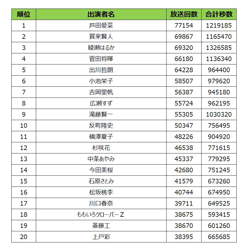2023年の出演者別ランキングでは、芦田愛菜さんが1位という結果となり、ソフトバンク「Y!mobile」のバカボン一家(芦田愛菜さん、出川哲朗さん、小池栄子さん)は、揃ってランクインしました。また、ラクス「楽楽精算」に出演している滝藤賢一さん、横澤夏子さんも大量出稿に後押しされランクインしました。