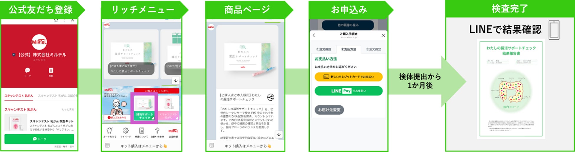 「わたしの腸活サポートチェック」は、株式会社ミルテルが1人でも多くの方に腸内環境検査をより簡単に利用いただくために、LINEだけで検査キット購入・決済から結果報告まで完結する腸活サポート検査としてサービスを開始したものです。