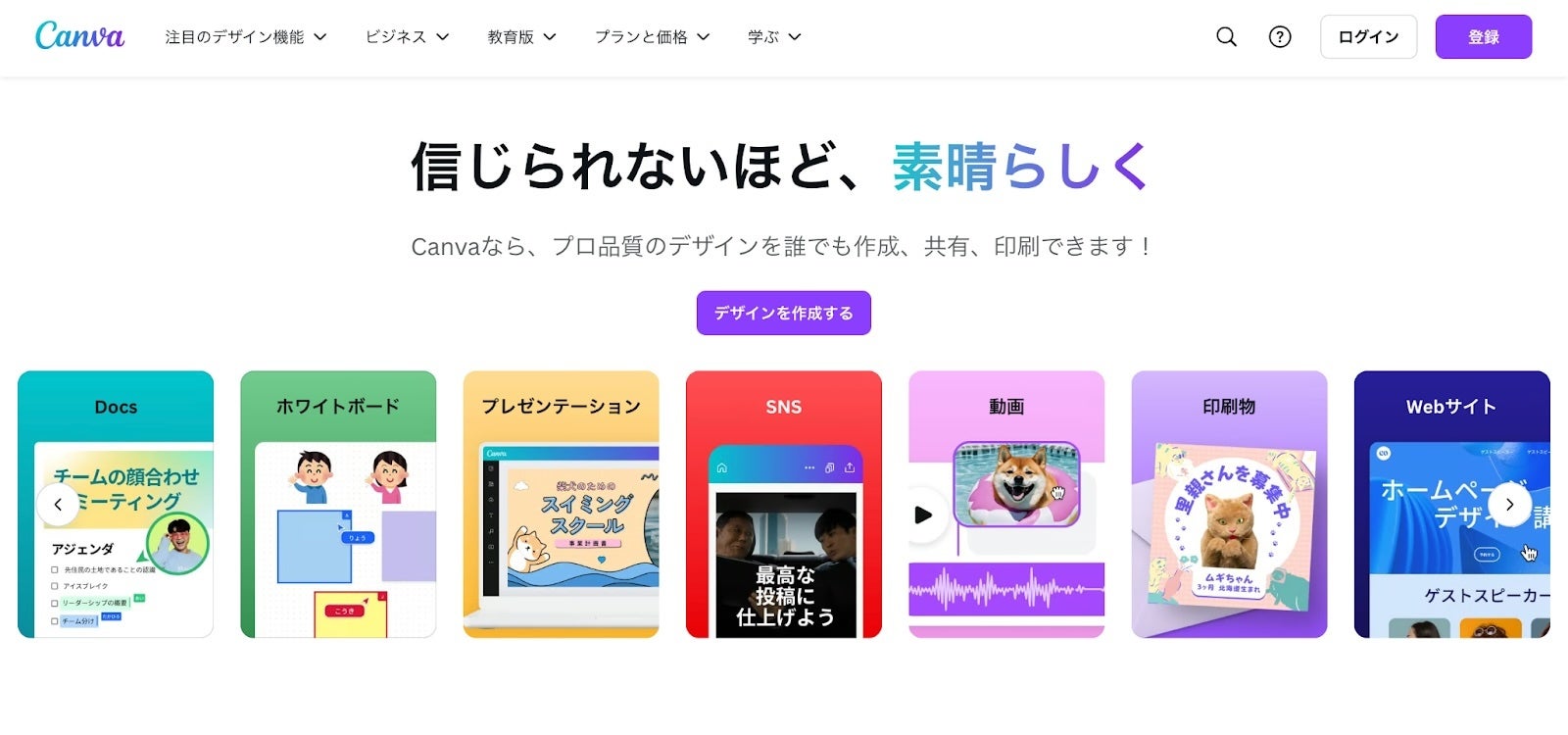 ドラッグ&ドロップで操作可能なシンプルなユーザーインターフェイスと、プレゼンテーション、ドキュメント、Webサイト、SNS向けグラフィック、ポスター、アパレル業界向けから動画制作向けのものなど幅広い種類のテンプレートに加え、フォント、ストックフォト、イラスト、動画、オーディオクリップの膨大なライブラリーを備えており、誰でも思いついたアイデアを美しい作品に仕上げることができます。