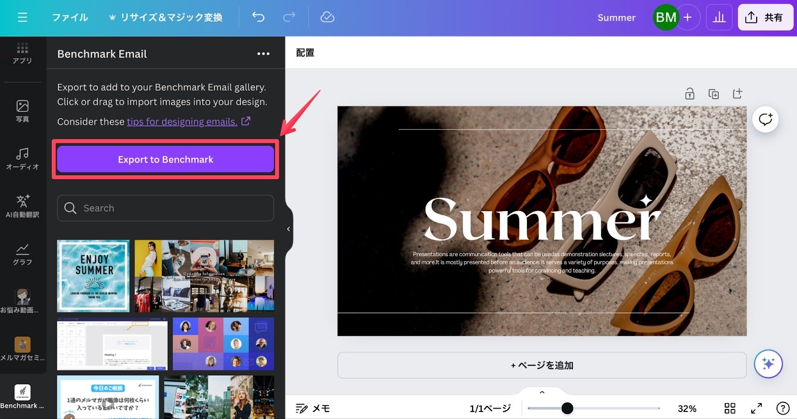 CanvaとBenchmark Emailを連携いただくと、Canvaで作成した画像をBenchmark Emailの画像ギャラリーに直接エクスポートすることができます。