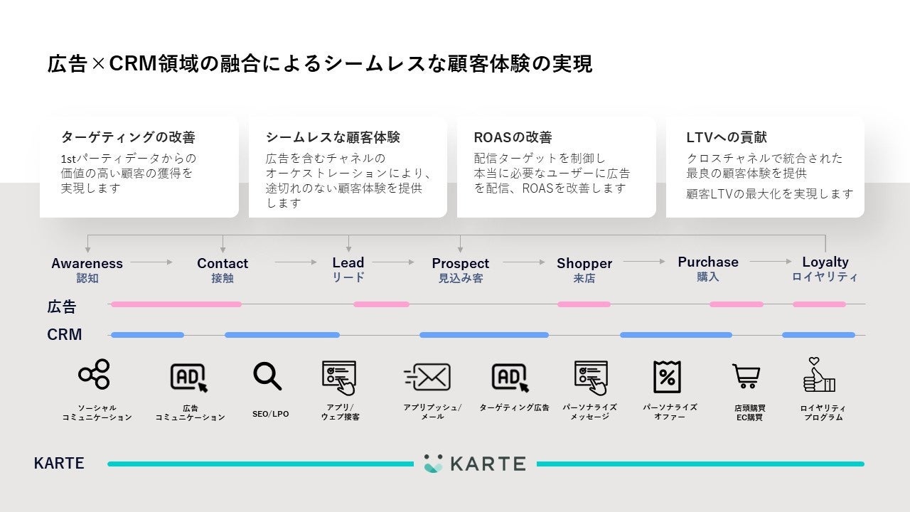 具体的には、顧客軸でリアルタイム分析・可視化を行うKARTEを用いて広告領域とCRM領域間で相互にデータを共有し、ソーシャル、広告、実店舗、ECまであらゆるコミュニケーションを含む一貫したマーケティング施策を行います。