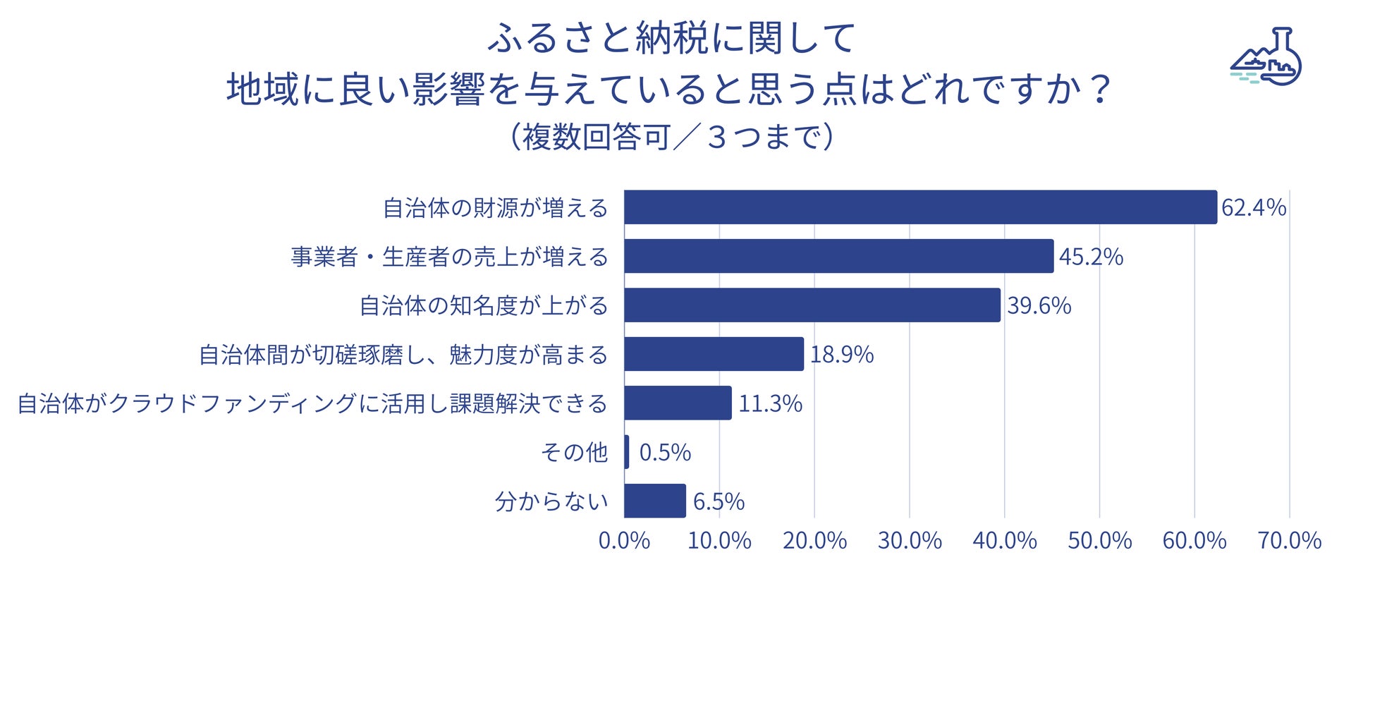 ・ふるさと納税が地域に良い影響を与えている点は、最多が「自治体の財源が増える」(62.4%)で次点が「事業者・生産者の売り上げが増える」(45.2%)。ふるさと納税が「地域や日本の役に立っている」と思う人は89.6%(「とてもそう思う」「まあそう思う」の計)。