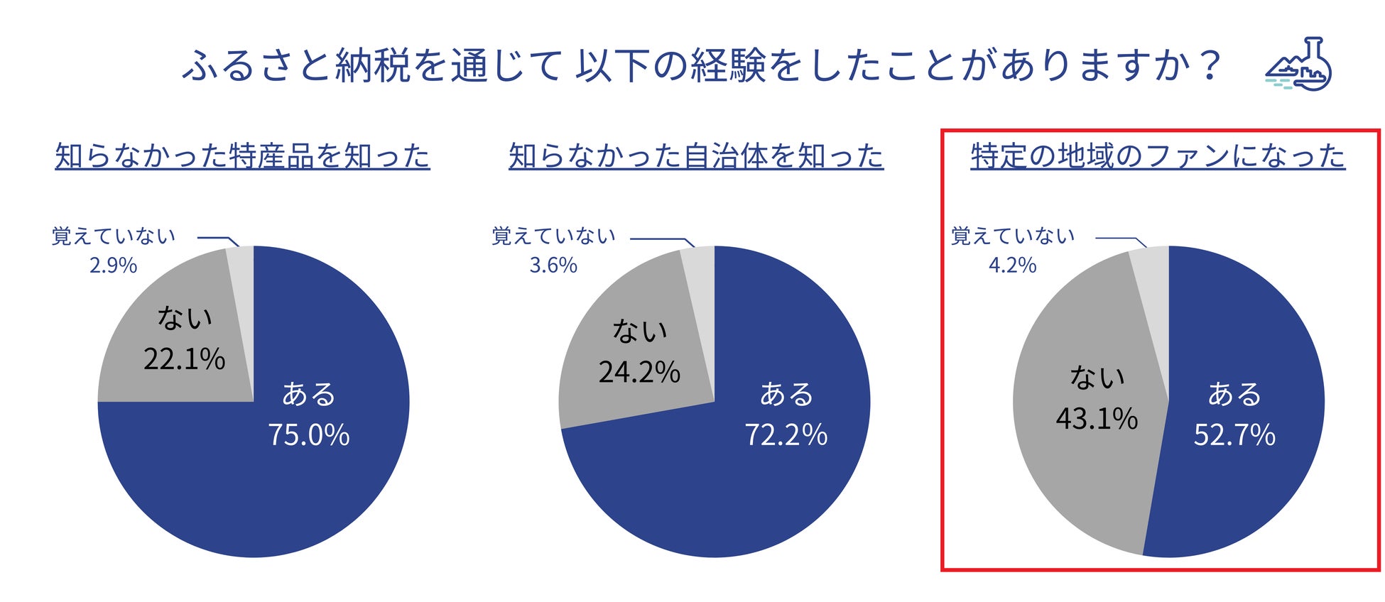 | 「ふるさと納税をきっかけに特定の地域のファンになった」人は52.7%で、前回調査※より11.8ポイント増えた。 ※出典:トラストバンク地域創生ラボ「ふるさと納税体験に関する調査 2023」2023年7月実施 https://www.trustbank.co.jp/newsroom/newsrelease/press651/ |