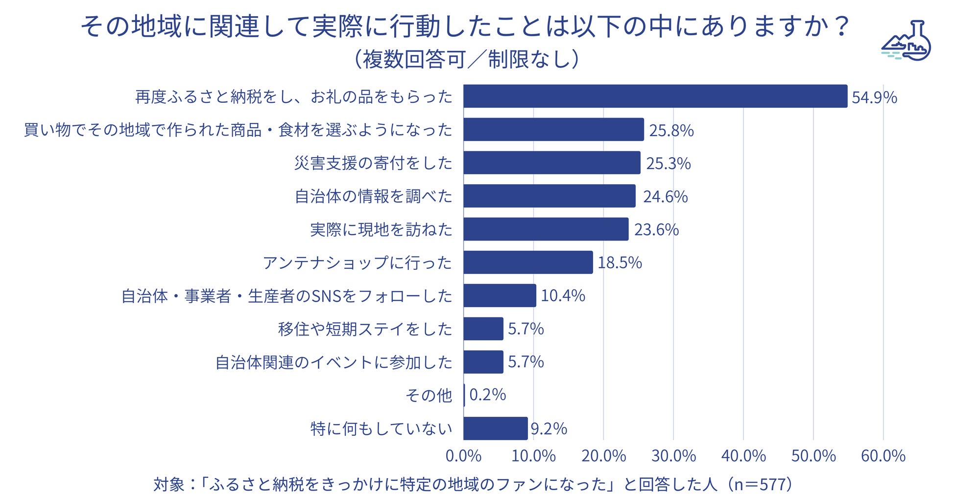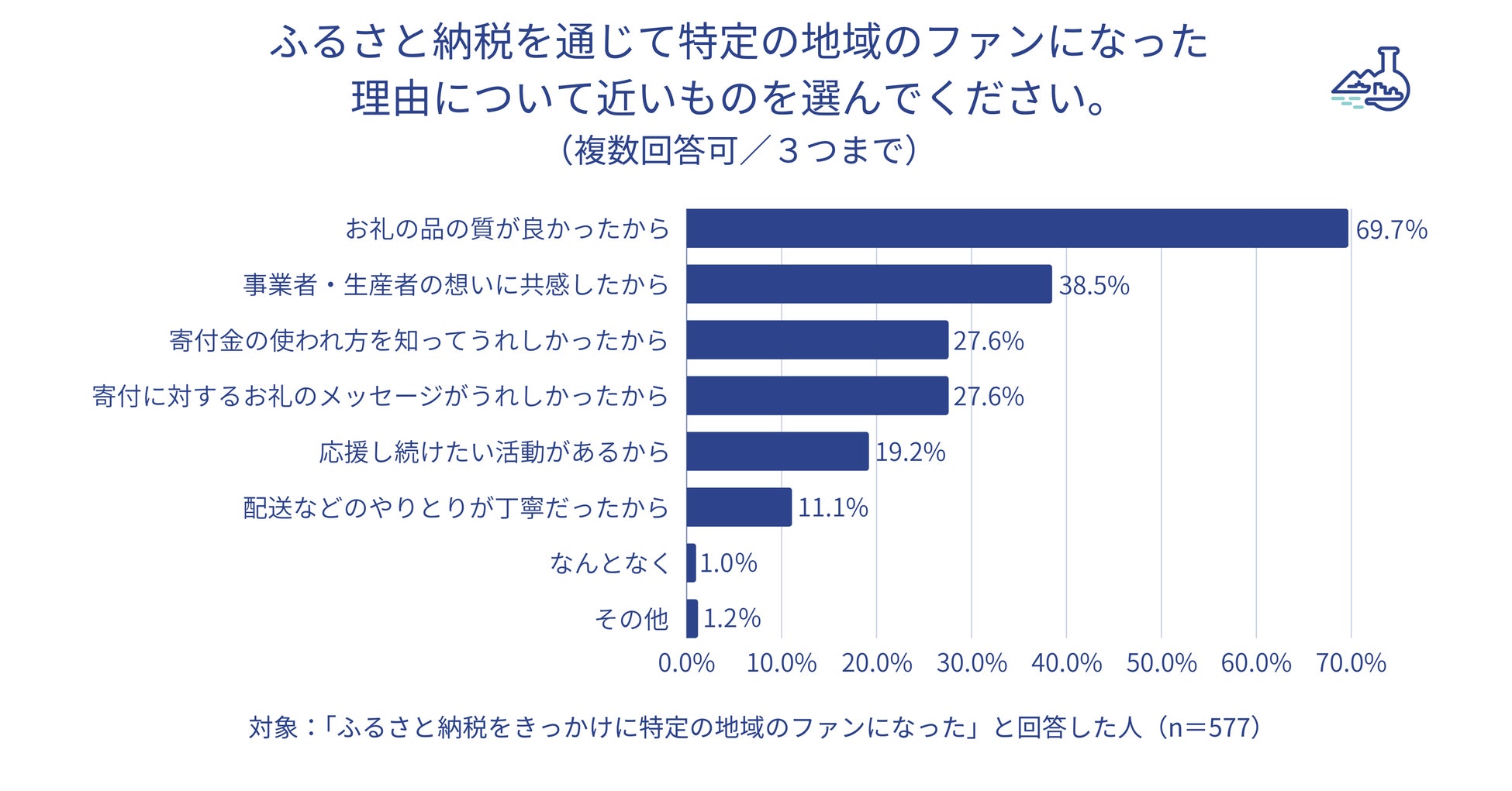 ・ ふるさと納税を通じて「知らなかった自治体を知る」「知らなかった特産品を知る」という経験がある人はいずれも7割超。また「寄付をきっかけに特定の地域のファンになる」という経験がある人は52.7%で、前回調査より11.8ポイント増えた。・ 特定の地域のファンになったことがある人において、その理由として最多は「お礼の品の品質が良かった」(69.7%)。またファンになったことで実際に行動したことは「再度ふるさと納税し、お礼の品をもらった」が54.9%で最も多く、続いて「買い物でその地域の食品・食材を選んだ」「災害支援の寄付をした」(25.8%、25.3%)も回答を集めた。