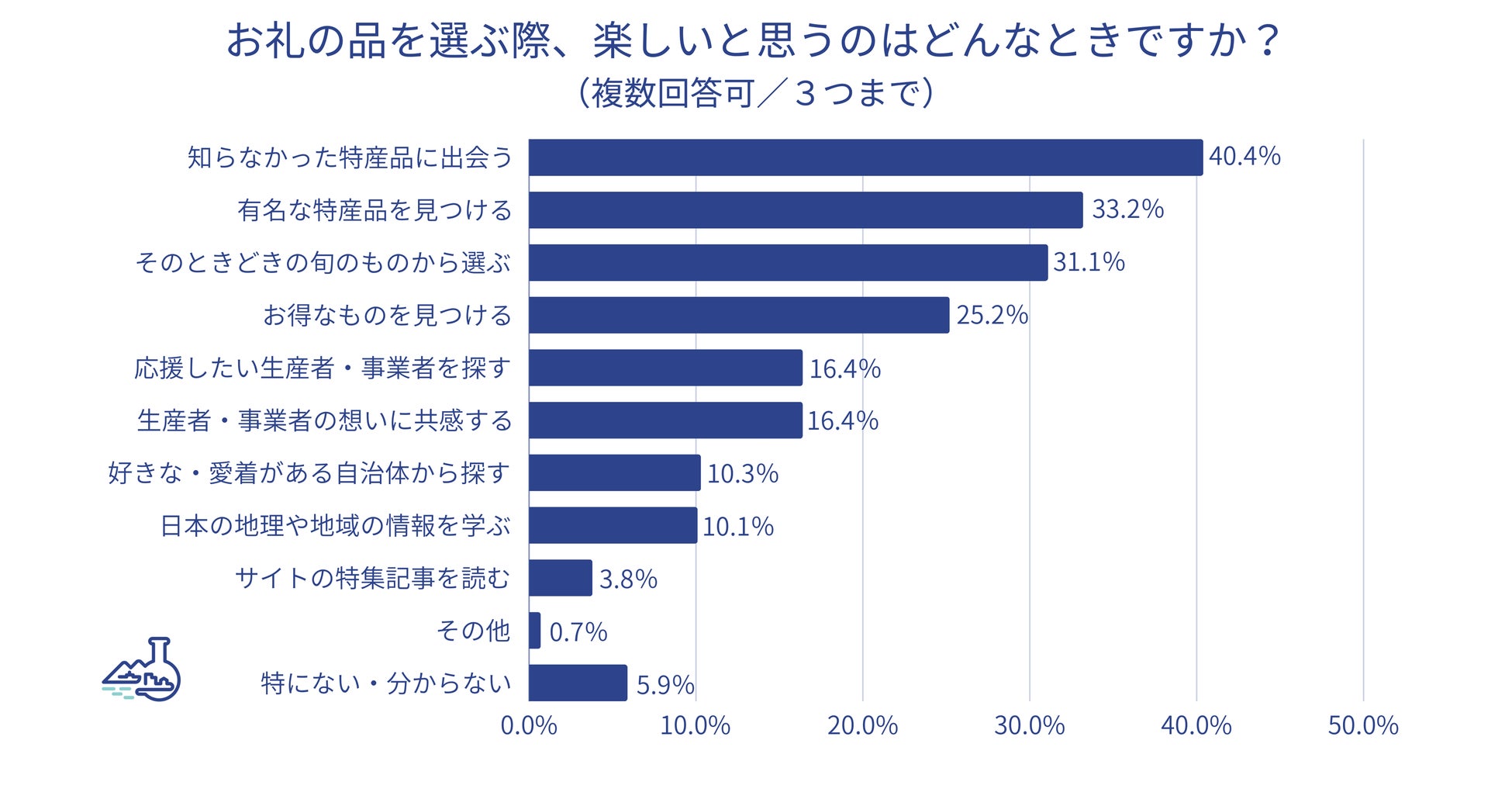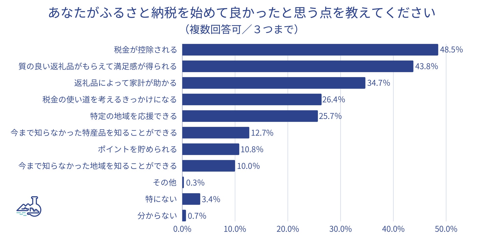 ・ ふるさと納税を始めて良かった点は、最多が「税金が控除される」(48.5%)、続いて「質の良い返礼品がもらえて満足感が得られる」(43.8%)。お礼の品選びで楽しいときについては「知らなかった特産品に出会う」(40.4%)、「有名な特産品を見つける」(33.2%)。