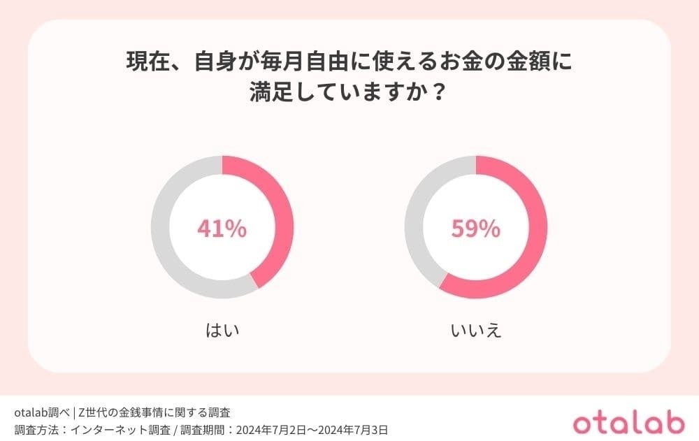 続いて、Z世代の人々が毎月自由に使えるお金の金額に満足しているのかについて知るべく、「現在、自身が毎月自由に使えるお金の金額に満足していますか?」という質問を行った。