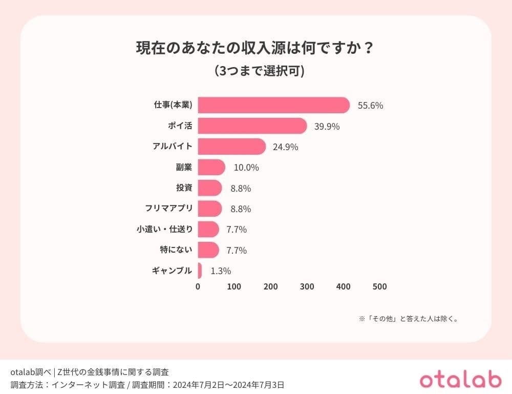 また、『副業』、『投資』、『フリマアプリ』も一定数見受けられるため、Z世代の収入源は多様化していることが分かった。