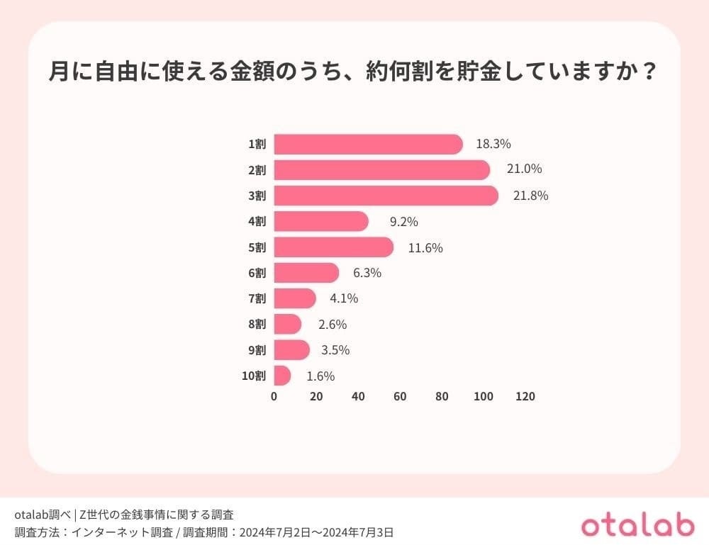 続いて、1つ前の質問で意識的に貯金していると回答した人を対象に、「月に自由に使える金額のうち、約何割を貯金していますか?」という質問を行った。