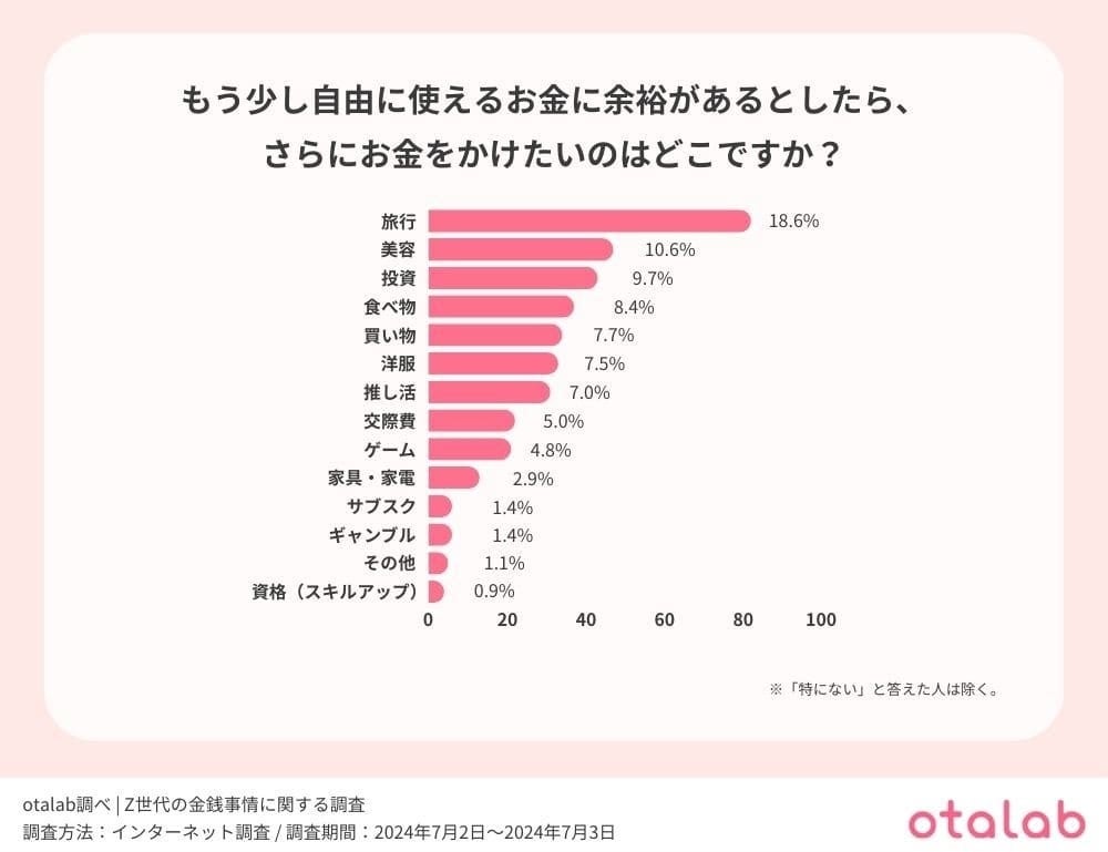 回答を見てみると、最も多かったのは『旅行』であり、次に『美容』、『投資』と続く結果となった。
