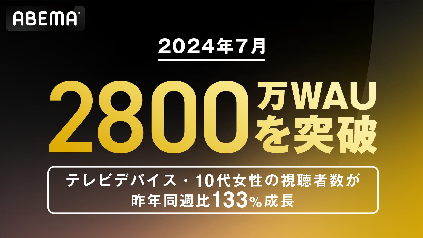 新しい未来のテレビ「ABEMA(アベマ)」は、2024年7月22日(月)から2024年7月28日(日)の期間における1週間の視聴者数(WAU:ウィークリーアクティブユーザー)が、2,800万を突破したことをお知らせいたします。(※)
