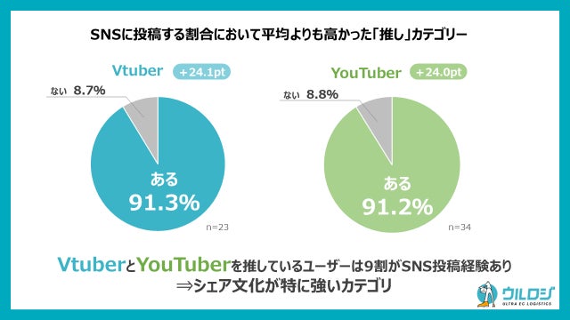この回答についてもカテゴリーによって分析してみた結果、VtuberとYotuberのファンは20pt以上の高い数値である9割の方がSNSに投稿した経験があることが判明しました。