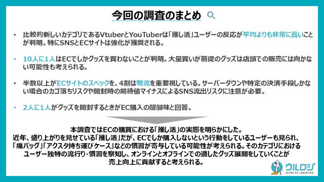 近年、盛り上がりを見せている「推し活」ですが、結果からECでしか購入しないというユーザーも散見られ、その裏には「痛バッグ」「アクスタ持ち運びケース」などの慣習が寄与している可能性も考えられます。カテゴリーにおけるユーザー独特の流行り・慣習を察知し、オンラインとオフラインでの適したグッズ展開をしていくことが売上向上に貢献すると考えられます。本調査レポートでは他にも分析した結果などを掲載しています。