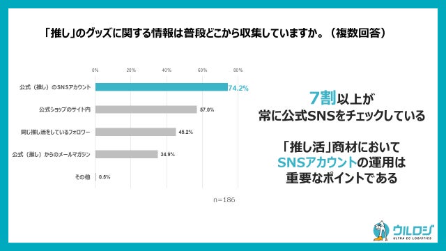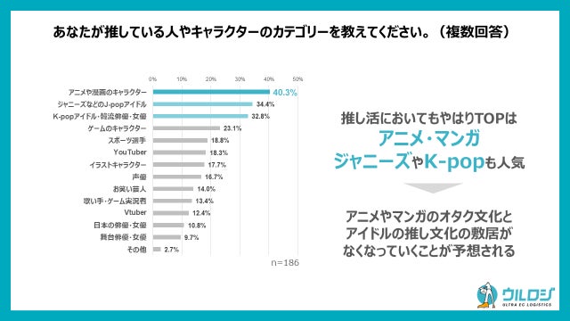 EC物流代行(発送代行)サービス「ウルロジ」、他DM発送、SEOやSNS運用などのインターネット事業等を展開しているディーエムソリューションズ株式会社(本社:東京都武蔵野市、代表取締役社長:花矢卓司、以下 DM ソリューションズ)は、全国の10-40代の男女で毎月「推し活」グッズを購入されている方186名を対象に「EC購買時の「推し活」に関する実態調査」を実施しましたのでお知らせします。