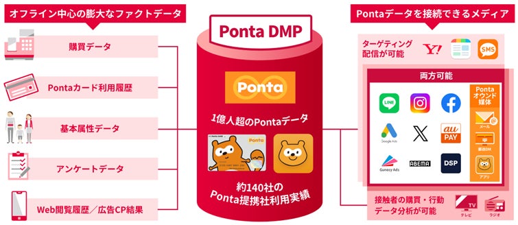 共通ポイントサービス「Ponta」の1億1811万人(2024年6月末時点)の会員基盤をベースに、オフライン中心の膨大なファクトデータを活用して企業のマーケティングを支援するサービス。LINE・Facebook・Instagram・YouTube 広告・Google ディスプレイ ネットワーク・X(旧Twitter)などへのターゲティング広告配信から、広告接触者のうち実際に店舗での購買に至った人数や購入金額などを算出するリアル購買分析まで、マーケティングのPDCAを回せる仕組みを提供しています。
