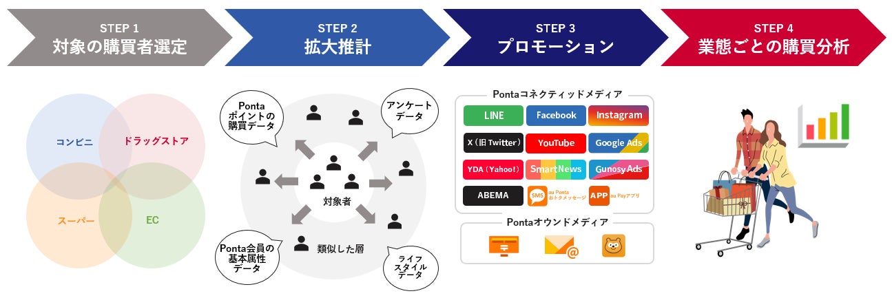 本サービスでは、LMがまず企業の要望に応じ、複数業態の購買データからターゲットを抽出します。次にPontaのIDに連携した多様なデータを用いてターゲットとの類似層を拡大推計します。そしてターゲットおよび類似層に広告を配信し、業態ごとの購買効果を検証します。効果検証では、属性データも掛け合わせて分析することで購買者像を可視化し、次の施策に生かしていただけます。