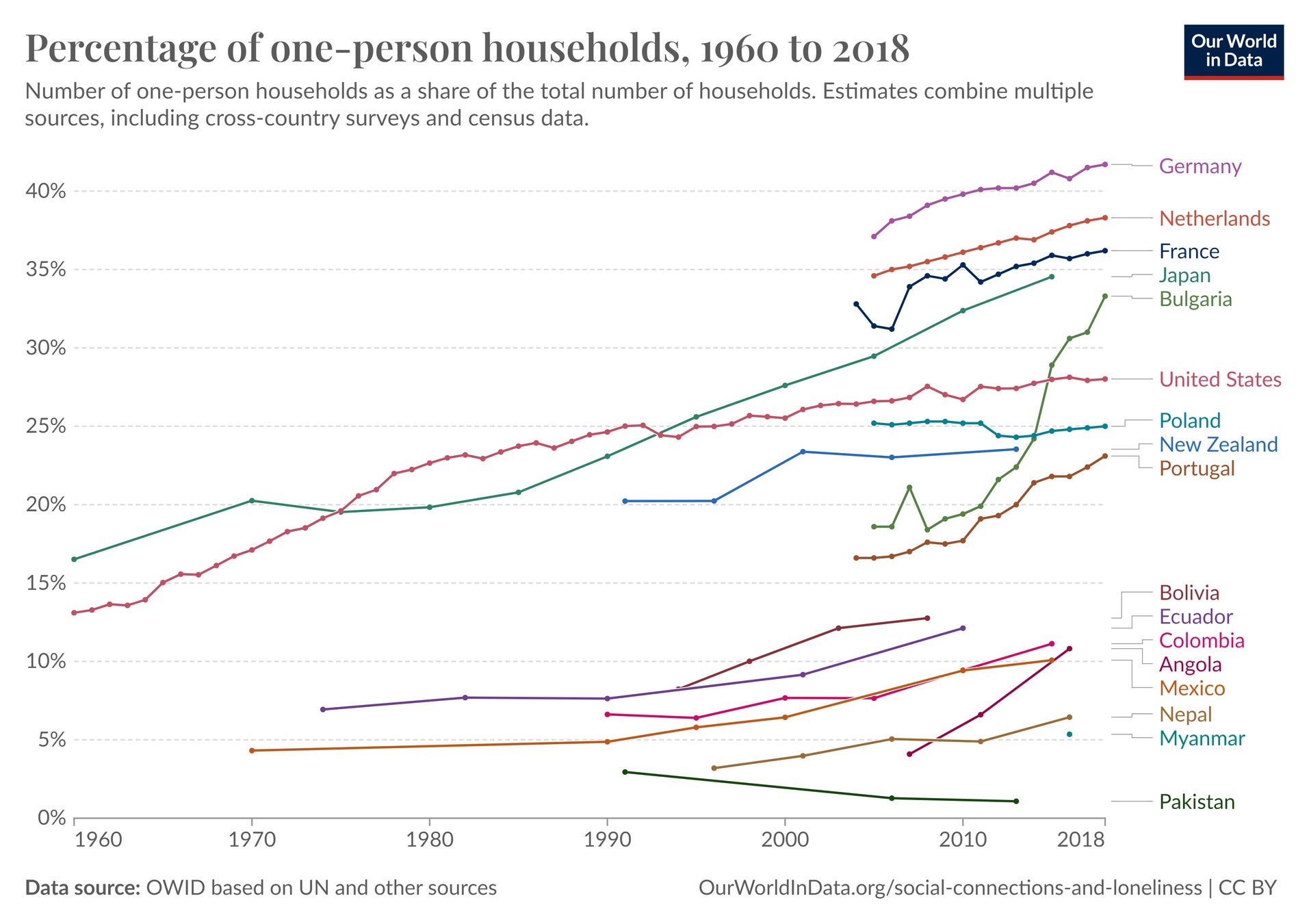 過去数十年間の社会と経済の変化とともに、各国の人口構造も大きく変動してきました。特に1960年代以降、先進国では現在までに単身世帯の数は倍以上に伸びています。国連のデータによると、ヨーロッパ諸国のうち12か国では、単身世帯が全世帯数の3分の1以上を占め、最も割合が高い国々(例:ドイツ、デンマーク、スウェーデン、ノルウェー、フィンランド)では約40%に及びます。 ヨーロッパ以外の先進国では、日本、アメリカ、カナダ、韓国の各国で約30%を占めています。このように、世界中で個人を主体とする経済構造「ソロエコノミー」へとパラダイムシフトが起こっています。