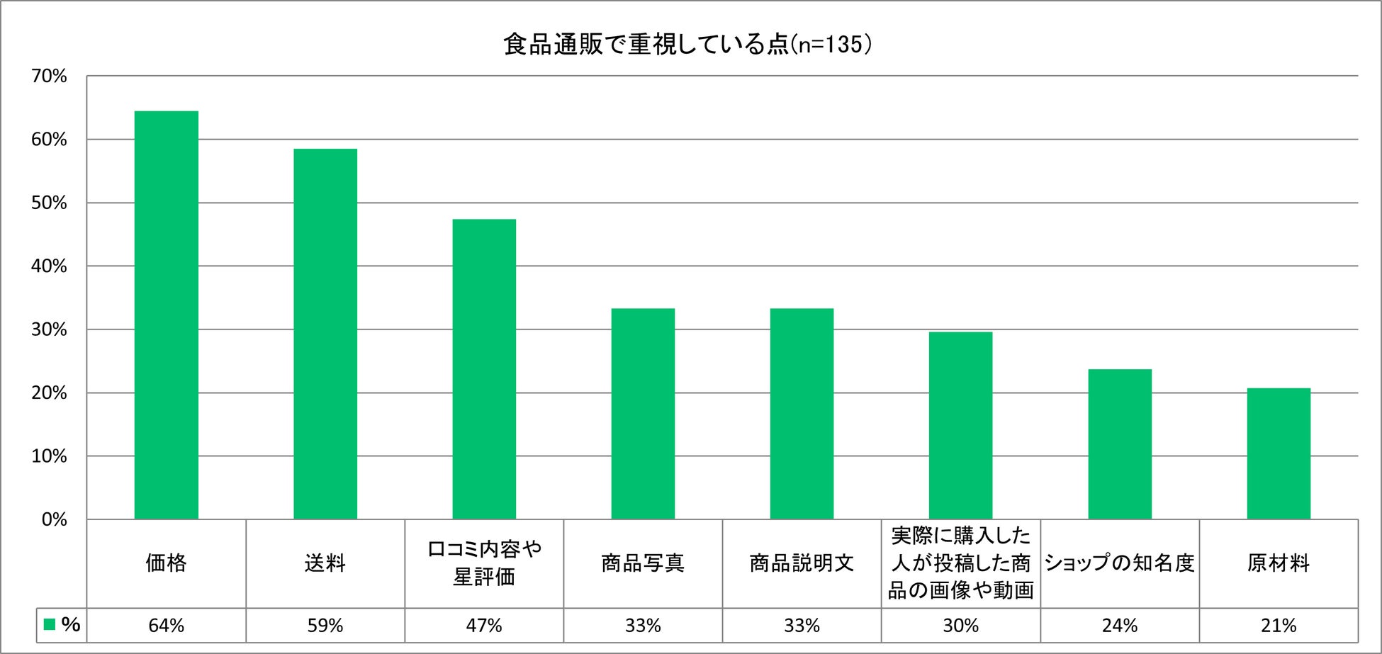 食品通販で購入する際、重視している点について「価格」が最多となり、「口コミ」は約50%となっています。価格設定を除いても口コミが食品通販の運営においても重要であることが分かります。