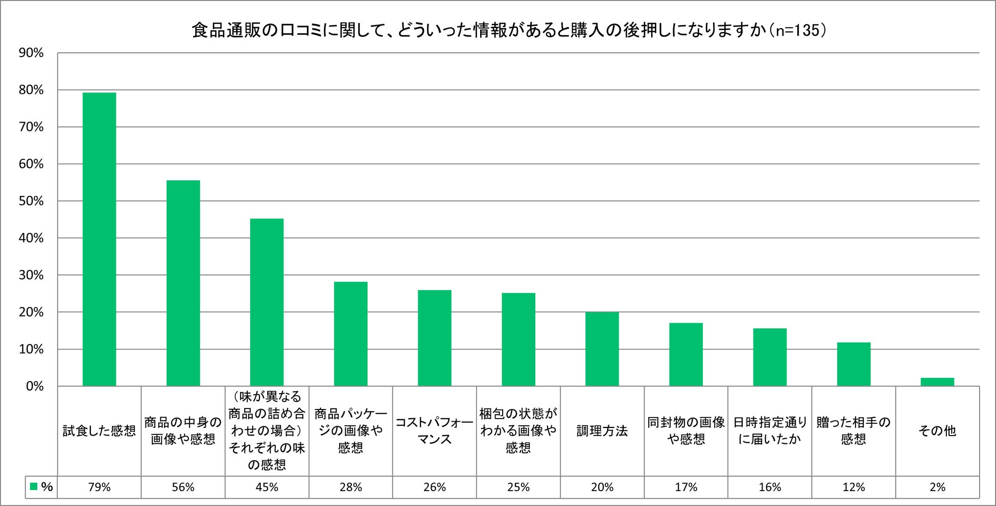 購入の後押しになる口コミとして「試食の感想(79%)」、「商品の中身の画像や感想(56%)」「詰め合わせなどの複数商品の味わい(45%)」が上位となりました。商品の価値や魅力がより強く伝わる口コミが、購入の際に大きな影響を与えています。