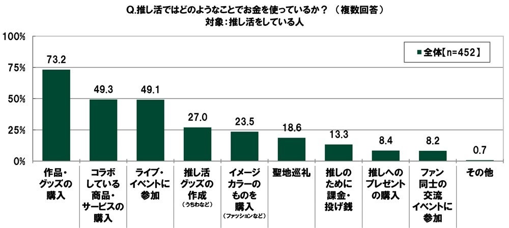 また、推し活ではどのようなことでお金を使っているか聞いたところ、「作品・グッズの購入」(73.2%)が最も高くなりました。次いで高くなったのは、「コラボしている商品・サービスの購入」(49.3%)、「ライブ・イベントに参加」(49.1%)、「推し活グッズの作成(うちわなど)」(27.0%)、「イメージカラーのものを購入(ファッションなど)」(23.5%)でした。