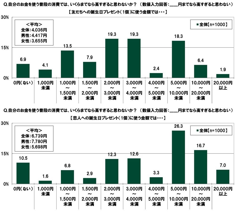 また、【友だちへの誕生日プレゼント(1個)に使う金額】では、「2,000円~3,000円未満」(19.3%)や「3,000円~4,000円未満」(19.3%)、「5,000円~10,000円未満」(18.3%)に回答が集まり、平均は4,036円でした。