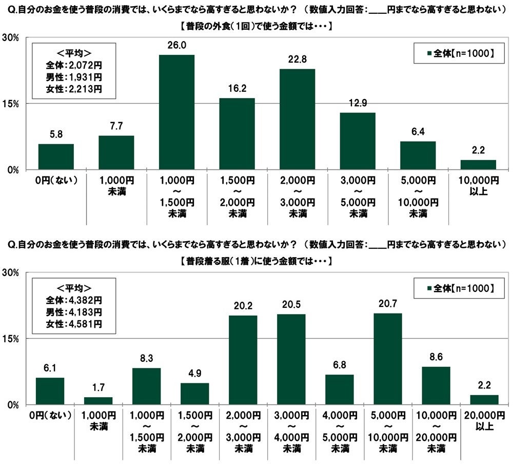 全回答者(1,000名)に、自分のお金を使う普段の消費では、いくらまでなら高すぎると思わないかを聞いたところ、【普段の外食(1回)で使う金額】では、「1,000円~1,500円未満」(26.0%)や「2,000円~3,000円未満」(22.8%)に多くの回答が集まり、平均は2,072円でした。