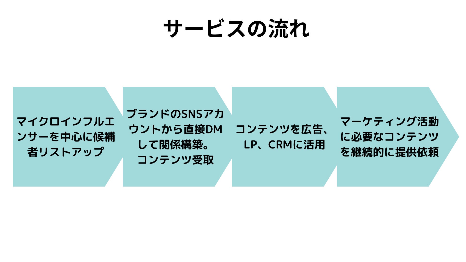 パッケージ概要:持続的に関わってもらえる方に連絡し、ファンインフルエンサーへと醸成。そして、制作いただいたコンテンツを広告やLPなど、マーケティング全体に活用することで共にブランド成長を図る