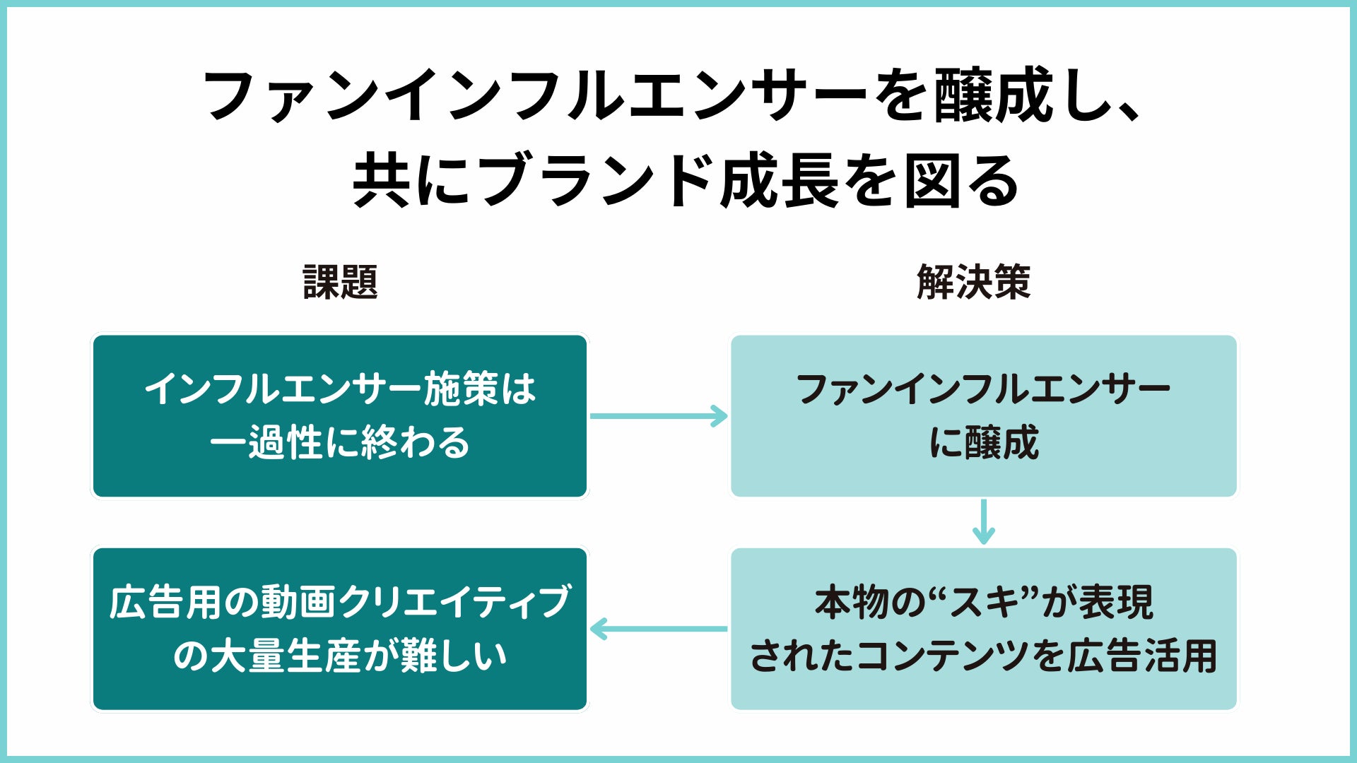 このような背景から、インフルエンサーをファンにすることで、一過性ではなく持続的にブランド成長に関わってもらうことを目的とするインフルエンサー施策パッケージを提供することにいたしました。